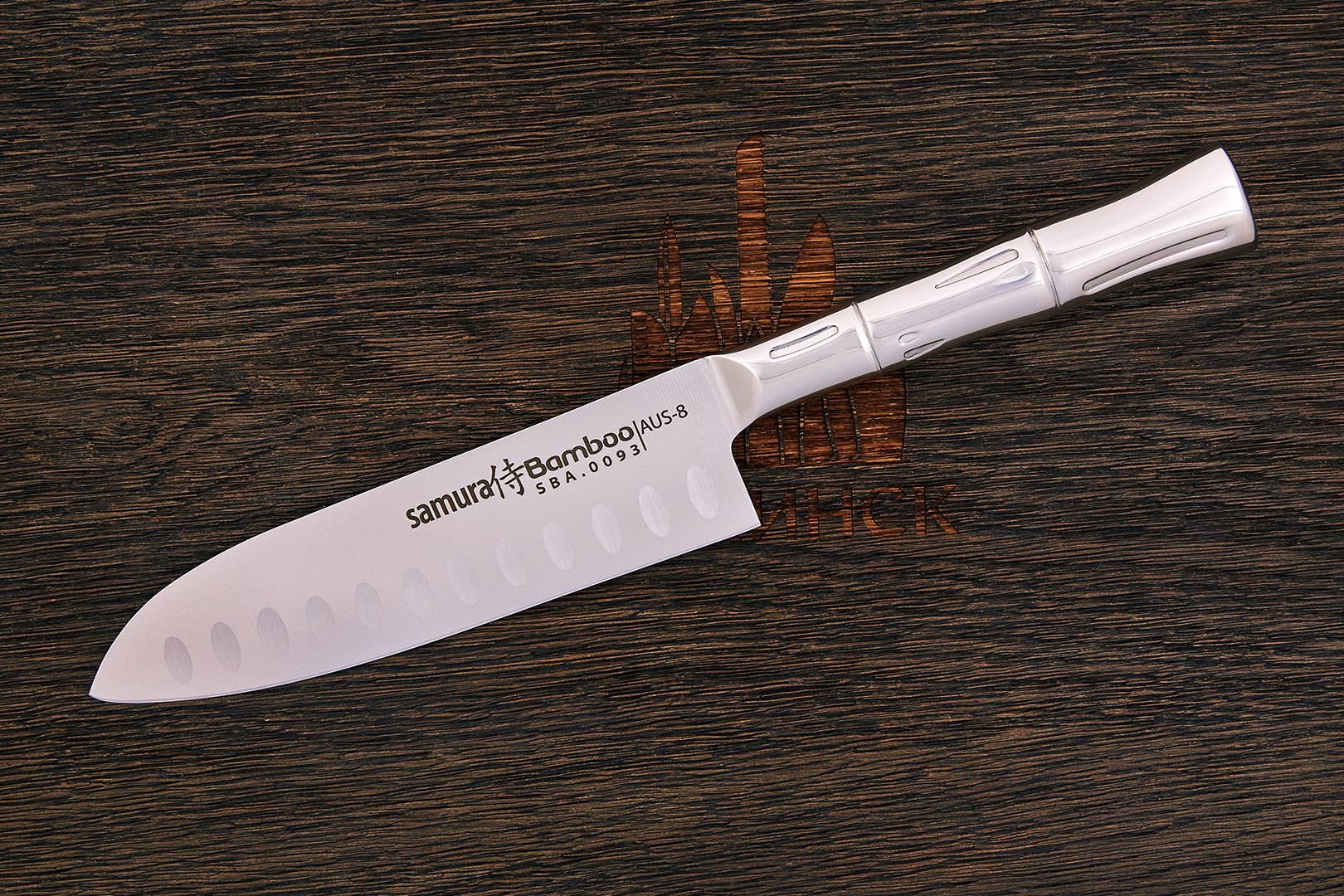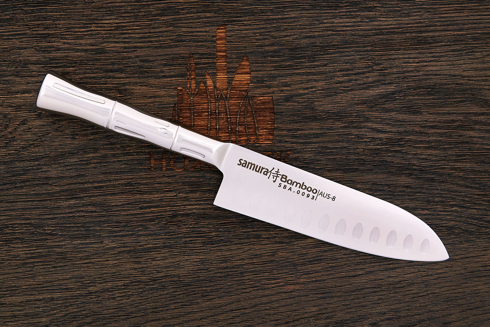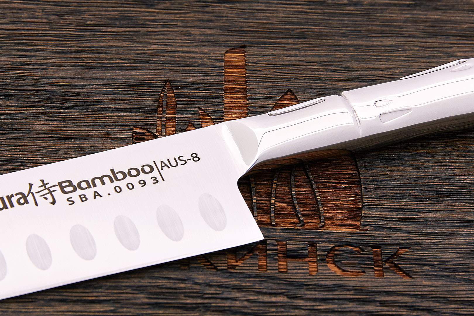 Каталог Кухонные ножи По бренду Samura Кухонные ножи Samura Серия Bamboo Нож кухонный Samura сантоку 137мм, сталь AUS-8, рукоять сталь | Арт SBA-0093/K