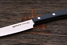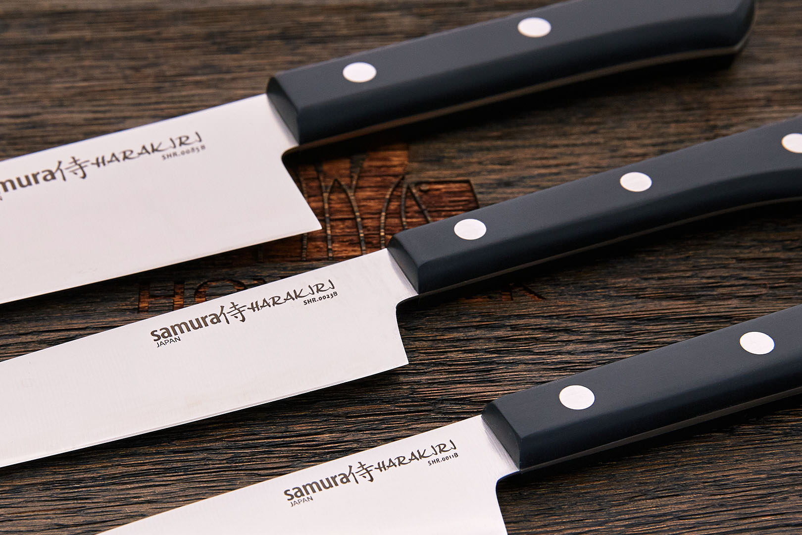 Мастерские кухонные ножи с тонким лезвием из высокотехнологичной коррозионностойкой стали AUS 8 (Aichi Steel Works). Двусторонняя заточка острых ножей Samura harakiri на водных камнях привлекает своим удобством не только европейцев, но и самих японцев. Легкий вес, оптимальный баланс формы и содержания "ложится под любую руку".