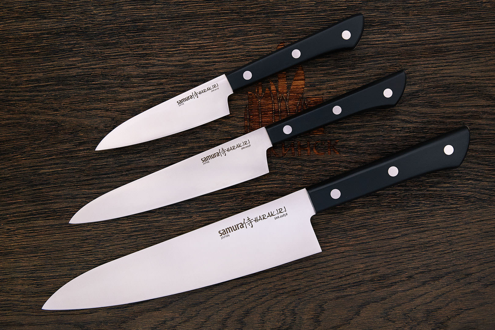 Каталог Кухонные ножи По бренду Samura Samura Harakiri Кухонный набор Samura из 3-х ножей, сталь AUS-8, рукоять пластик | Арт SHR-0220B