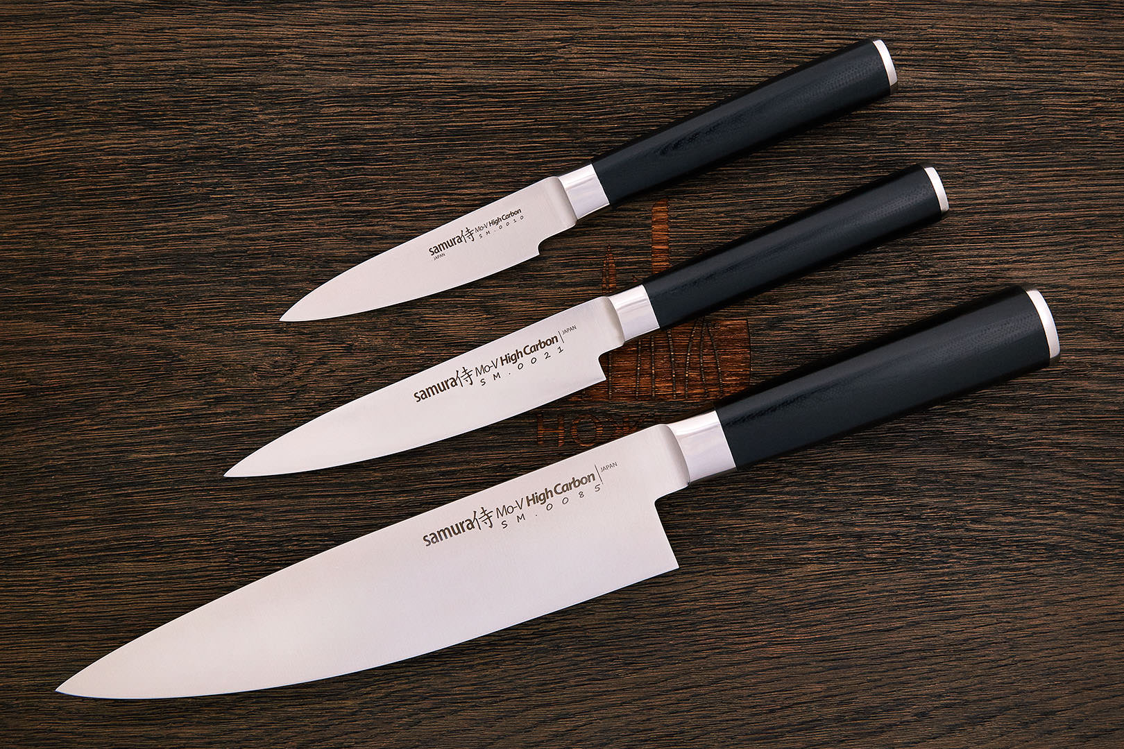 Каталог Кухонные ножи По бренду Samura Samura Mo-V Кухонный набор Samura из 3-х ножей в подарочной коробке, сталь AUS-8, рукоять G10 | Арт SM-0220