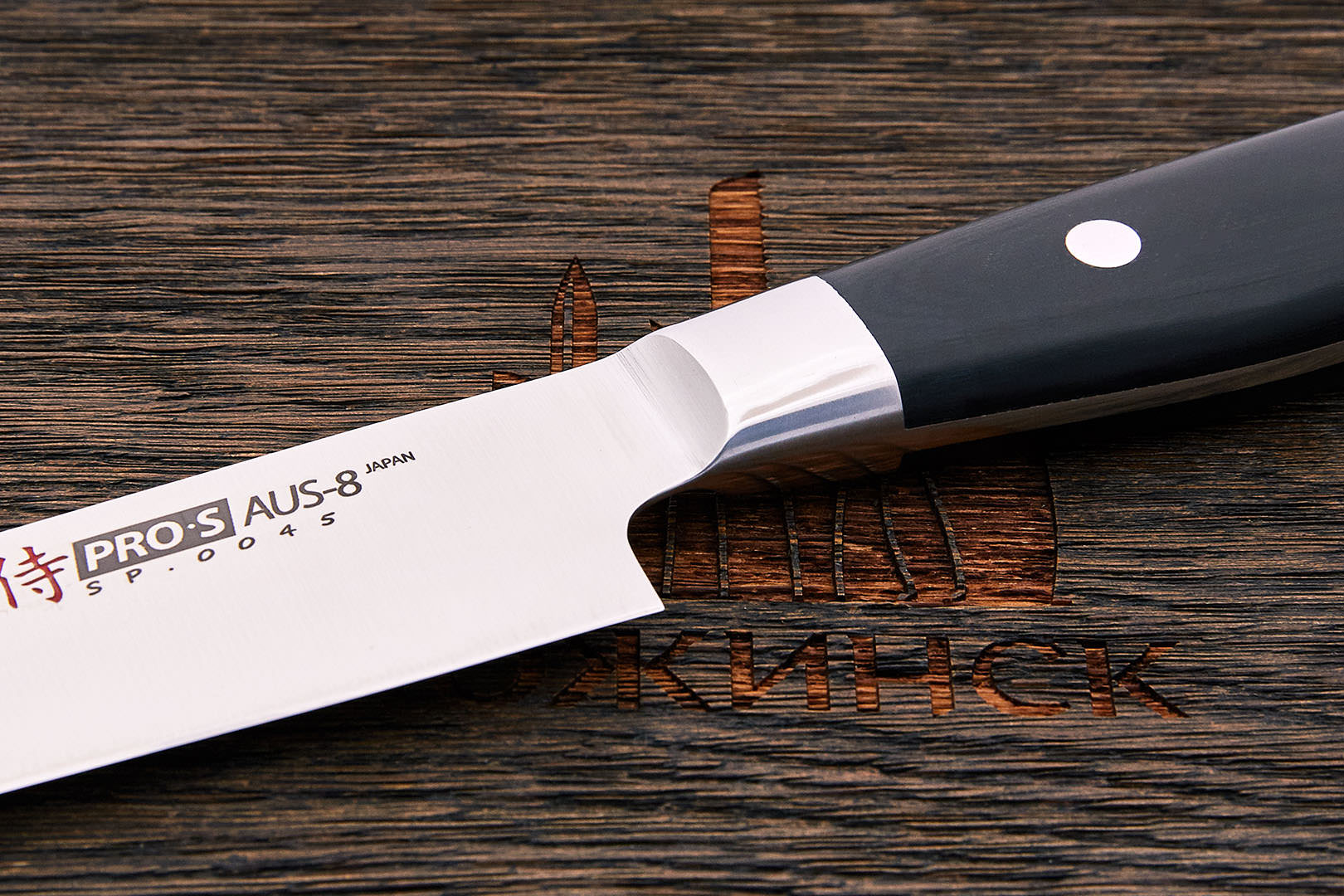 AUS-8 – среднеуглеродистая высоколегированная нержавеющая сталь. Разработана и производиться японской металлургической компанией Aichi Steel Works. При таком содержании углерода и хрома в структуре стали появляются эвтектические карбиды, однако их количество еще невелико. Благодаря этому, на высоком уровне остаются механические свойства, сталь легко шлифуется и полируется. Сталь очень стабильна, предсказуема и недорога. Однако благодаря своей структуре, при хорошей термообработке AUS-8 отличается высокой агрессивностью реза по мягким материалам. Оптимальная твердость 57-59 HRC.