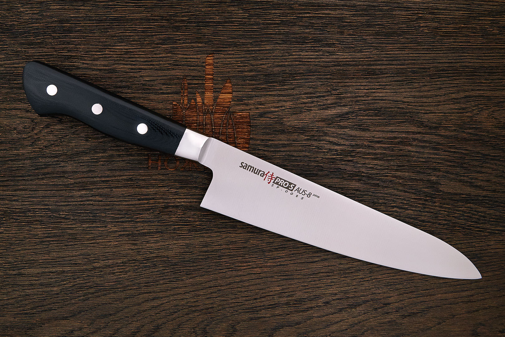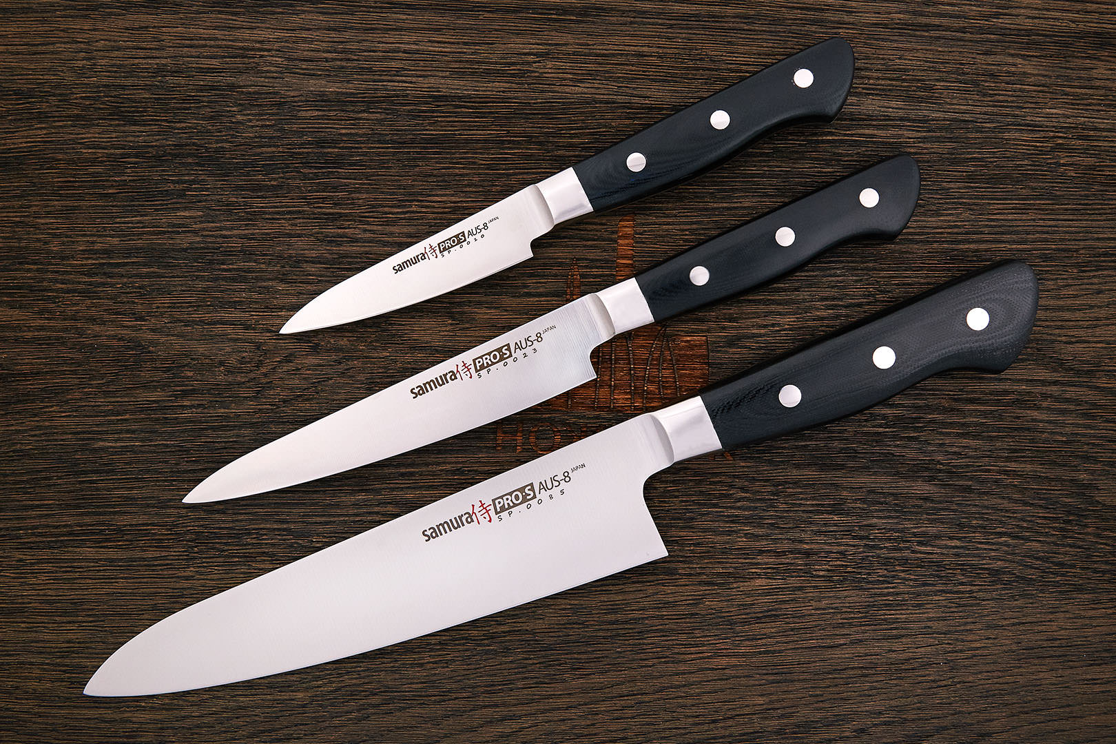 Каталог Кухонные ножи По бренду Samura Samura. Pro-S Поварская тройка Samura из 3-х ножей в подарочной коробке, сталь AUS-8, рукоять G10 | Арт SP-0230