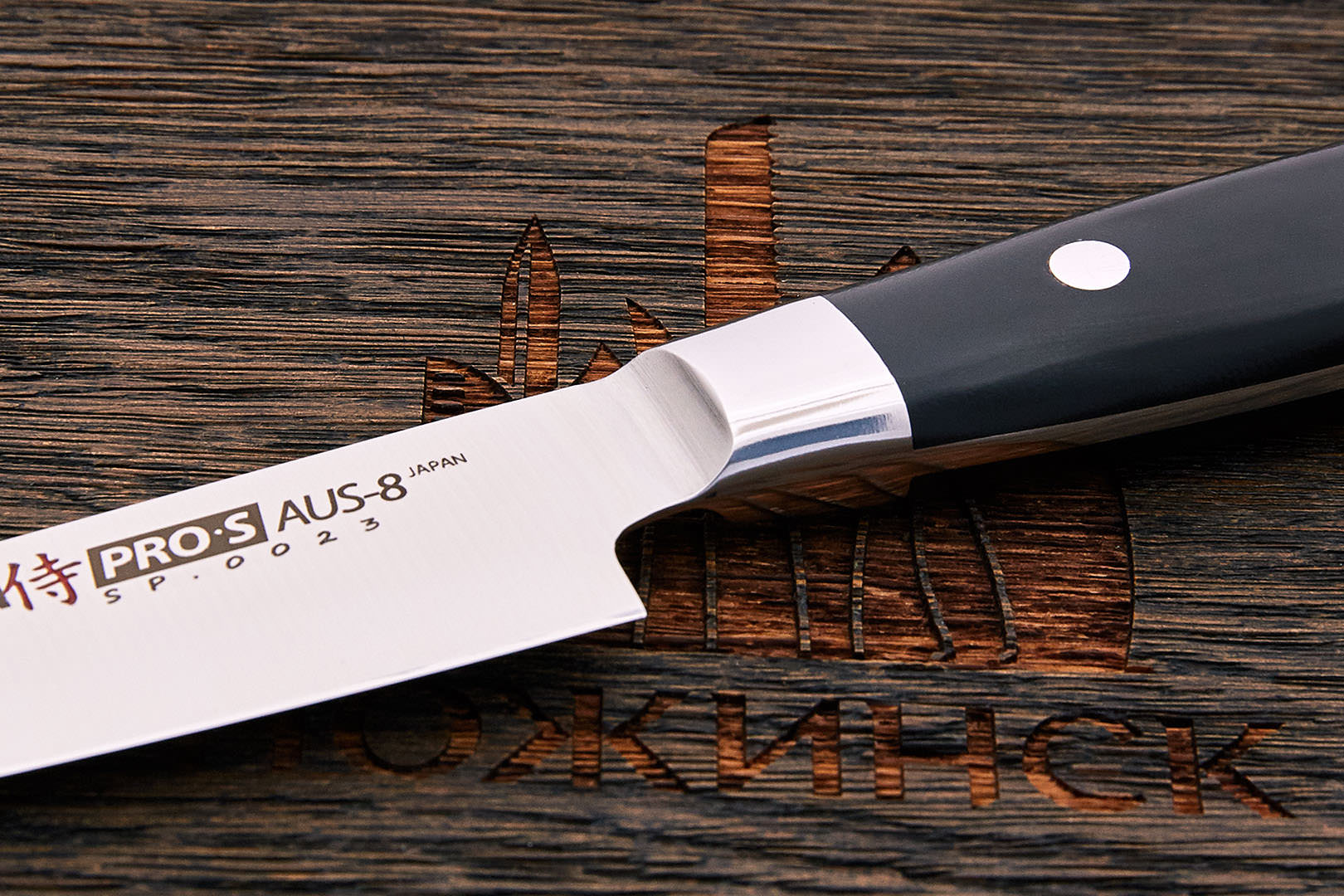 AUS-8 – среднеуглеродистая высоколегированная нержавеющая сталь. Разработана и производиться японской металлургической компанией Aichi Steel Works. При таком содержании углерода и хрома в структуре стали появляются эвтектические карбиды, однако их количество еще невелико. Благодаря этому, на высоком уровне остаются механические свойства, сталь легко шлифуется и полируется. Сталь очень стабильна, предсказуема и недорога. Однако благодаря своей структуре, при хорошей термообработке AUS-8 отличается высокой агрессивностью реза по мягким материалам. Оптимальная твердость 57-59 HRC.