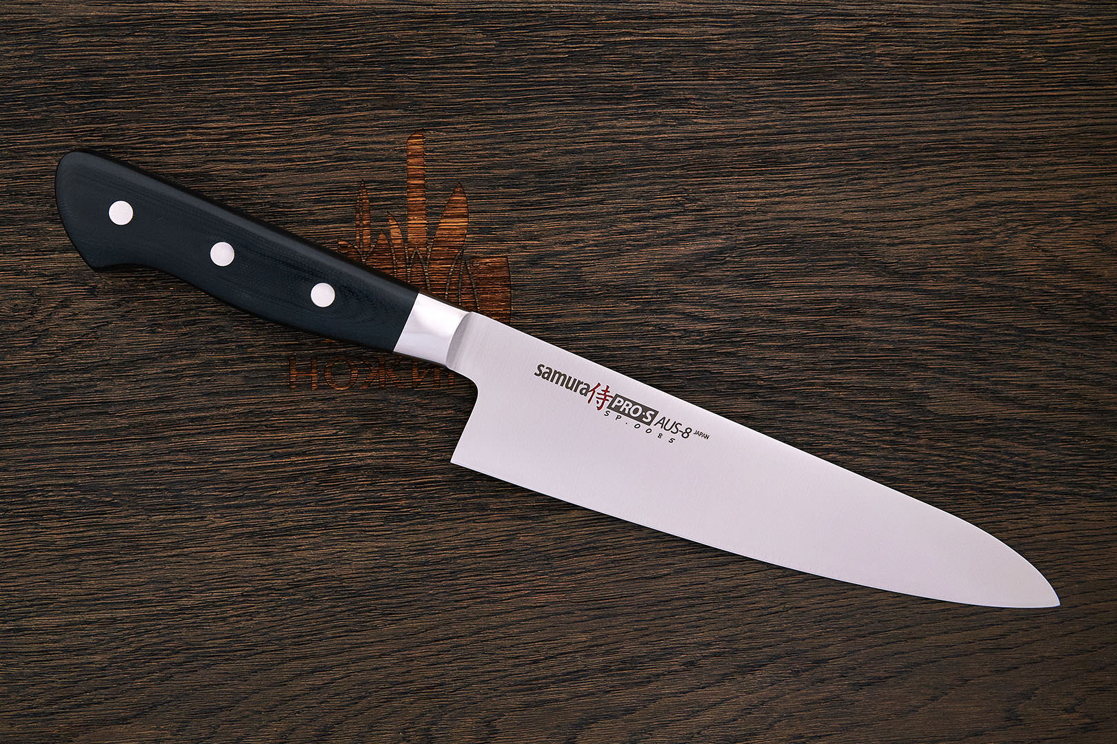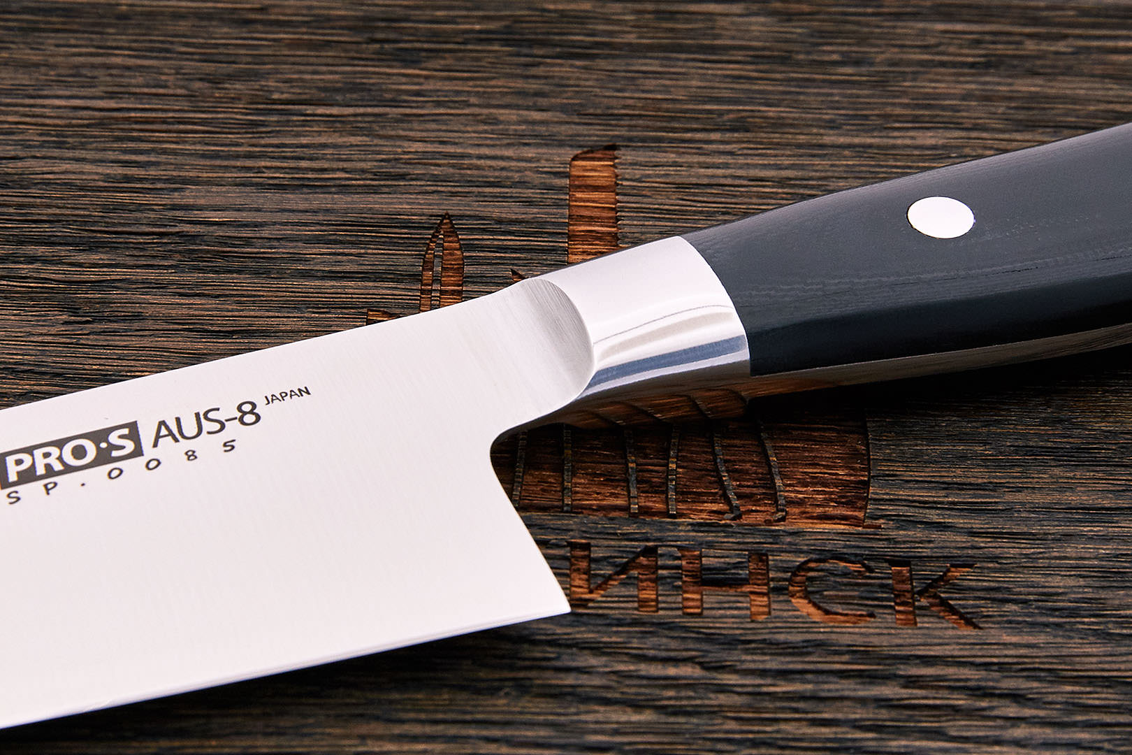 AUS-8 – среднеуглеродистая высоколегированная нержавеющая сталь. Разработана и производиться японской металлургической компанией Aichi Steel Works. При таком содержании углерода и хрома в структуре стали появляются эвтектические карбиды, однако их количество еще невелико. Благодаря этому, на высоком уровне остаются механические свойства, сталь легко шлифуется и полируется. Сталь очень стабильна, предсказуема и недорога. Однако благодаря своей структуре, при хорошей термообработке AUS-8 отличается высокой агрессивностью реза по мягким материалам. Оптимальная твердость 57-59 HRC.