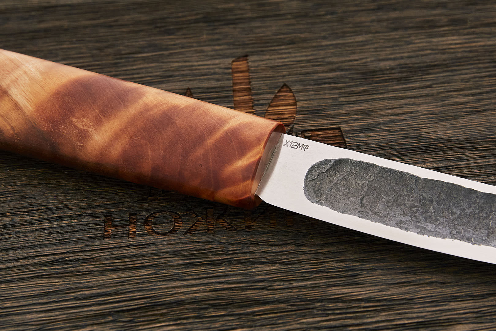 Х12МФ – высоколегированная условно коррозионностойкая сталь российского производства. Аналог американской D2. В состав стали входят молибден, ванадий, никель и другие. Сочетание элементов придает стали отличную прочность, упругость, устойчивость к воздействию температур, износоустойчивость.