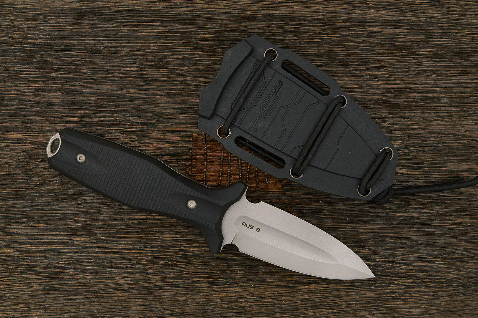 AUS-8 – среднеуглеродистая высоколегированная нержавеющая сталь. Разработана и производиться японской металлургической компанией Aichi Steel Works. При таком содержании углерода и хрома в структуре стали появляются эвтектические карбиды, однако их количество еще невелико. Благодаря этому, на высоком уровне остаются механические свойства, сталь легко шлифуется и полируется. Сталь очень стабильна, предсказуема и недорога. Однако благодаря своей структуре, при хорошей термообработке AUS-8 отличается высокой агрессивностью реза по мягким материалам. Оптимальная твердость 57-59 HRC.