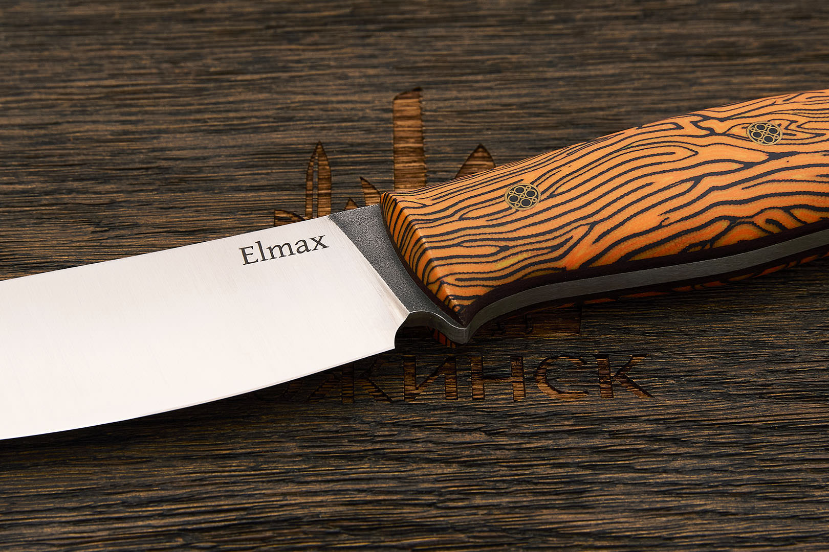 Elmax – одна из лучших инструментальных коррозионностойких порошковых сталей. Выпускается австрийско-шведской компанией Böhler-Uddeholm по технологии третьего поколения (superclean), что означает повышенную чистоту и вязкость. В составе карбиды небольшого размера, которые способствуют агрессивному резу. Сталь не капризна в заточке, долго удерживает остроту режущей кромки. При качественной термообработке Elmax всегда превосходит аналоги по вязкости, устойчива к воздействию внешней среды. Такой комплекс свойств обеспечивает изготовленным из нее ножам отличные потребительские качества.