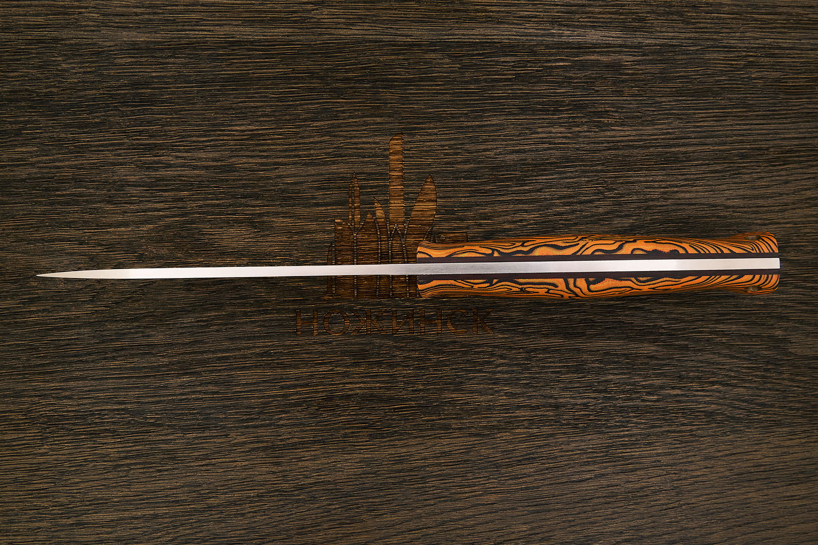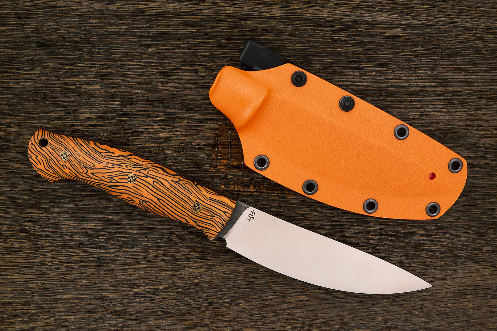 Микарта – очень прочный конструкционный материал, представляющий собой слоистый пластик на основе ткани и фенолформальдегидных или эпоксидных смол. Слои ткани пропитываются и склеиваются под высоким давлением и температурой. Благодаря совокупности потребительских свойств micarta (текстолит) прекрасно подходит для изготовления рукоятей ножей. Прочная, не впитывает ни воду, ни запахи, тактильная и высоко декоративная за счет разнообразия текстур и цветов. По теплопроводности микарта близка к натуральному дереву, что позволяет достаточно комфортно использовать ножи на сильном морозе.
