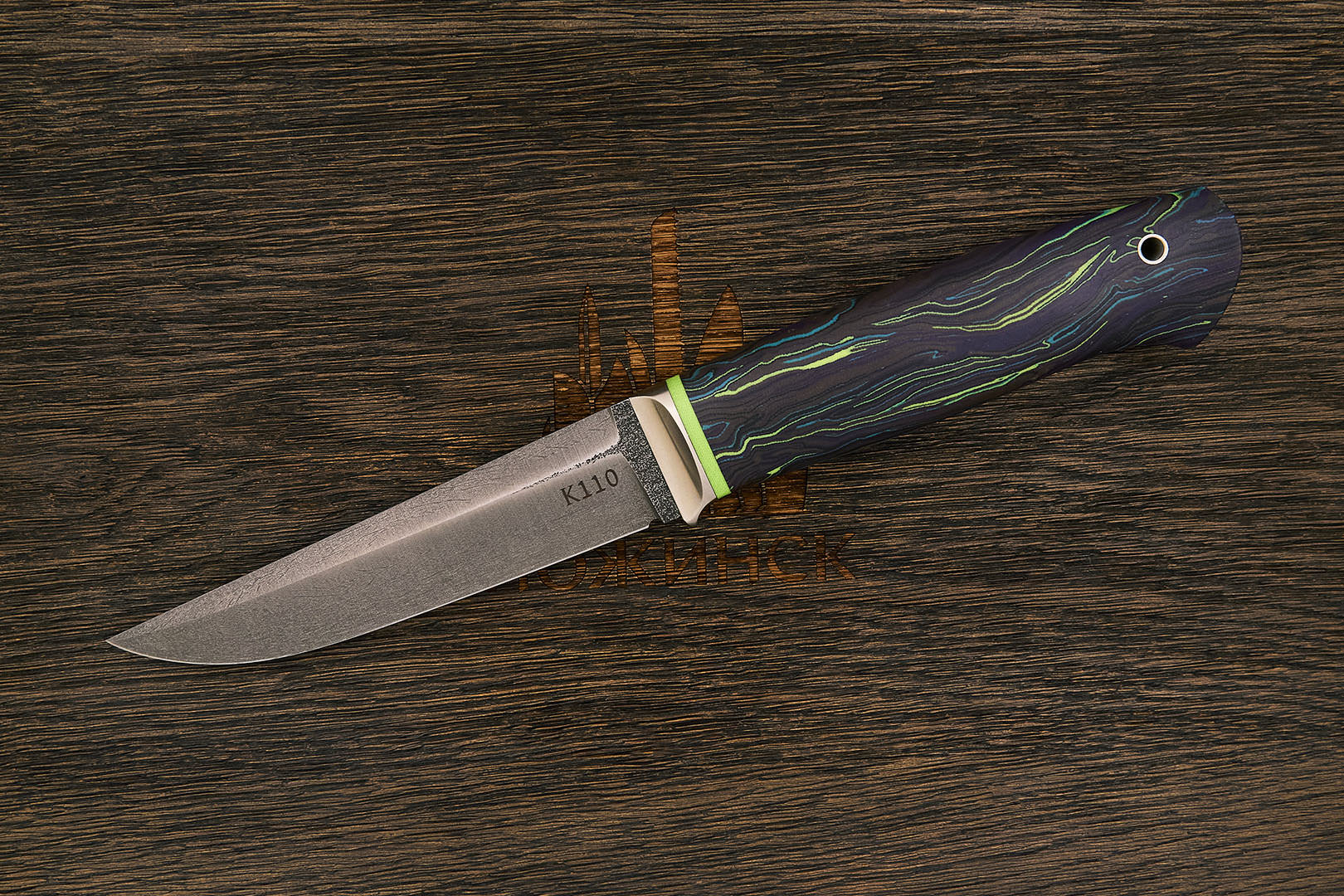 K110 – высокоуглеродистая высокохромистая холодноштамповая инструментальная сталь австрийско-шведского концерна Böhler-Uddeholm полученная методом электрошлакового переплава, что обеспечивает низкие микро- и макросегрегации, а также чистоту и гомогенность микроструктуры. Проще говоря, содержит меньше вредных примесей и равномерно распределенные карбиды. Твердость К110 после термообработки в пределах 60-62 HRC. Хорошо подходит для закалки на воздухе.