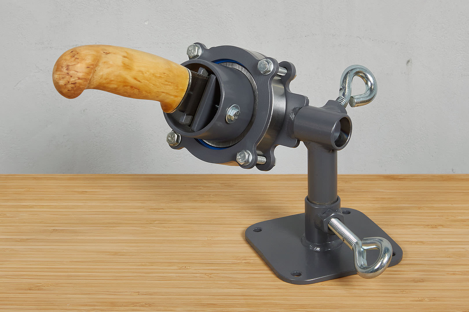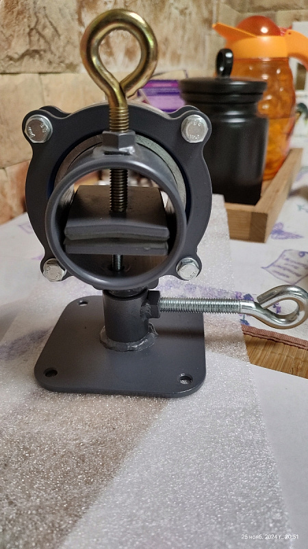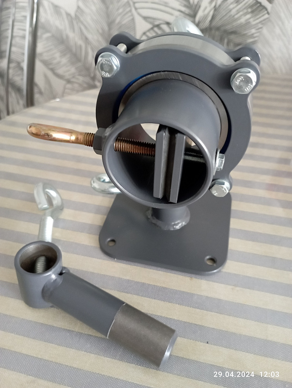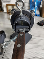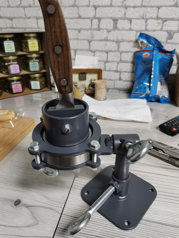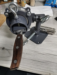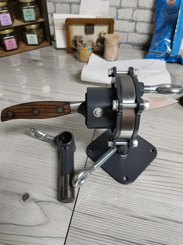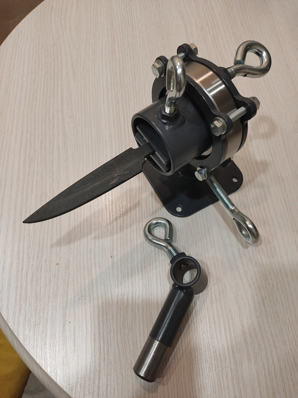 Специальные тисы для работы с рукоятями ножей. Есть возможность закрепить на стол или в стационарные слесарные тисы. Две оси вращения головы и поворотный механизм вдоль оси ножа на мягком подшипниковом ходу. Тисы позволяют зажимать клинок с шириной до 40 мм и толщиной до 12 мм. В стандартном исполнении подходят для большинства задач, связанных с изготовлением ножей, а при необходимости съемные губки можно заменить на губки индивидуальной конструкции.