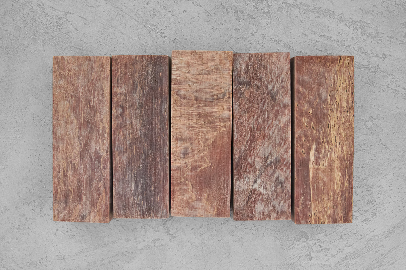 Приблизительные размеры бруска 133×29×47 мм. На фотографии представлен образец, максимально соответствующий среднему бруску из партии, но фактическая текстура и тон каждой заготовки для рукояти будет незначительно отличаться.