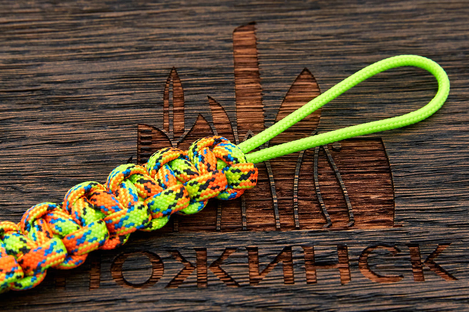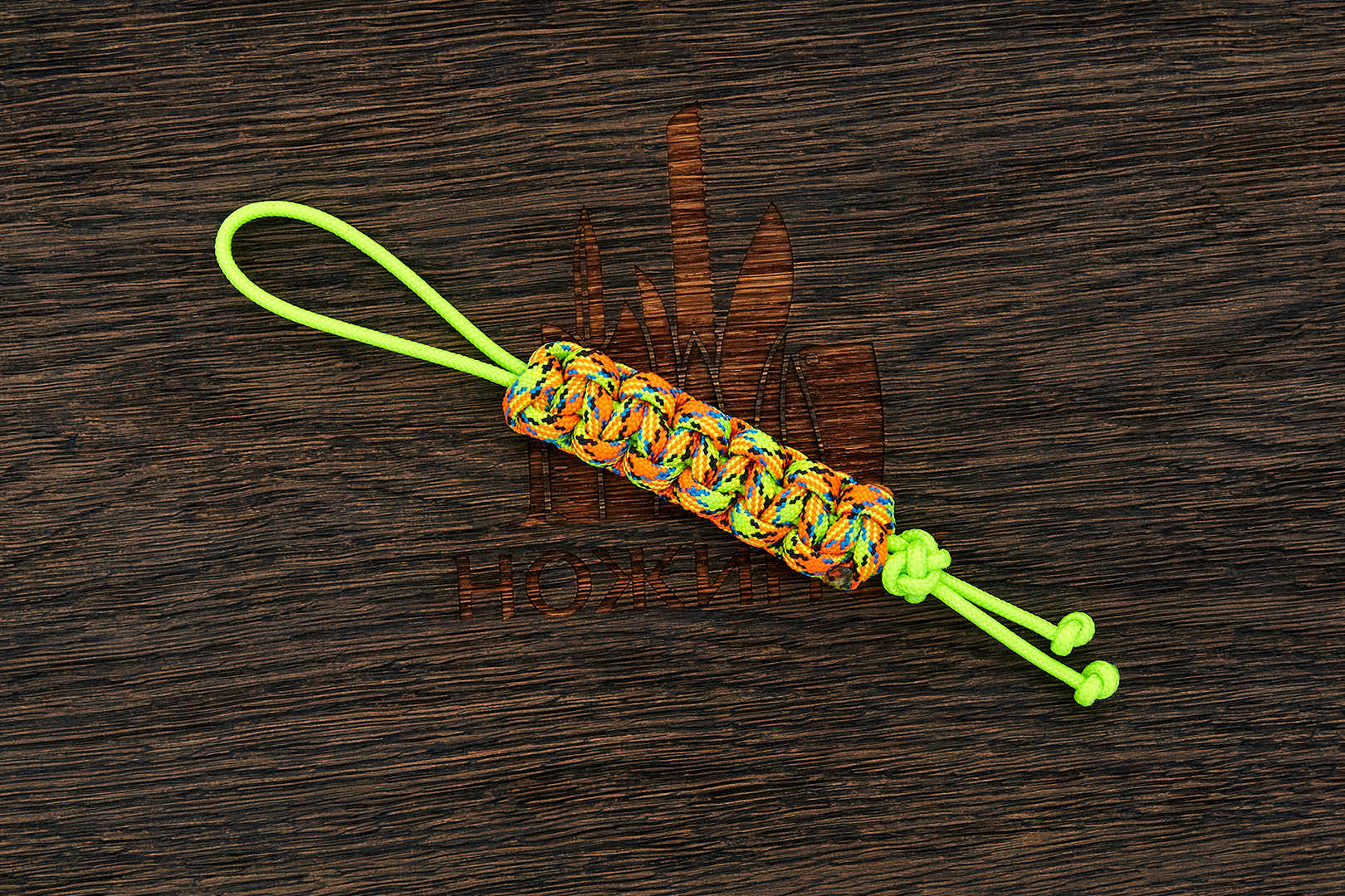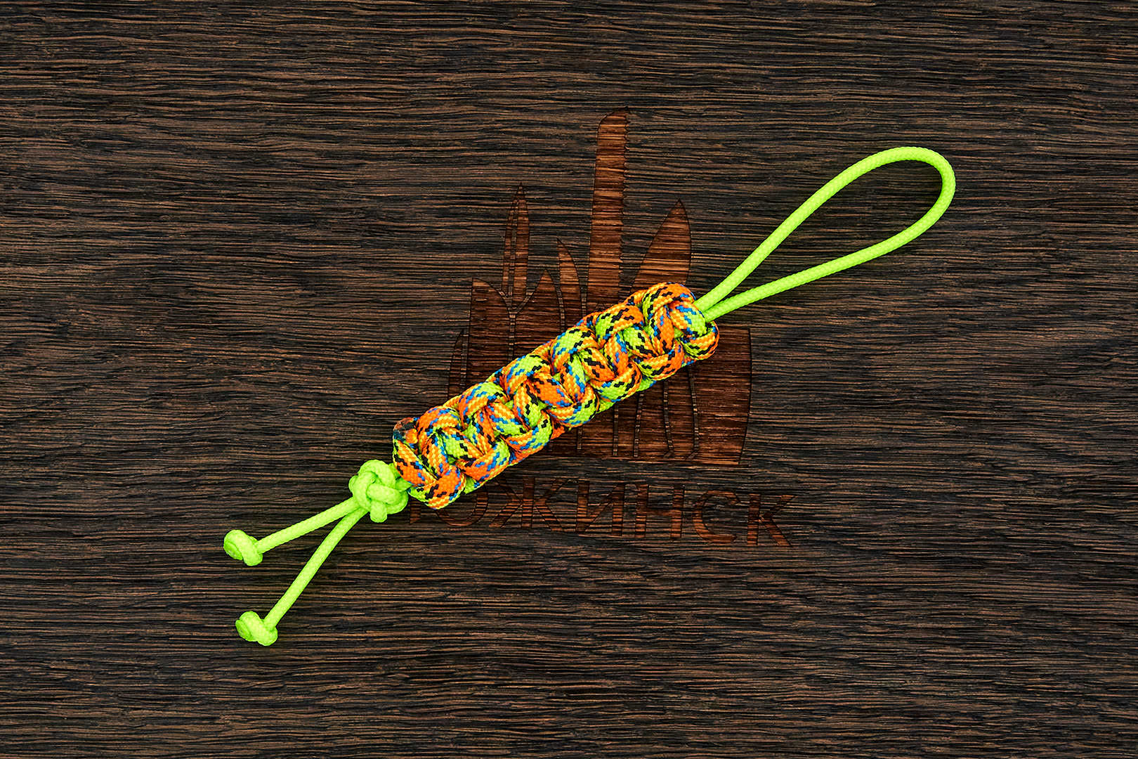 Темляк плоского плетения изготовлен из американского паракорда Type-III 550 cord (плетение) и 275 cord (петля) " Virus + Neon green". Размеры:
