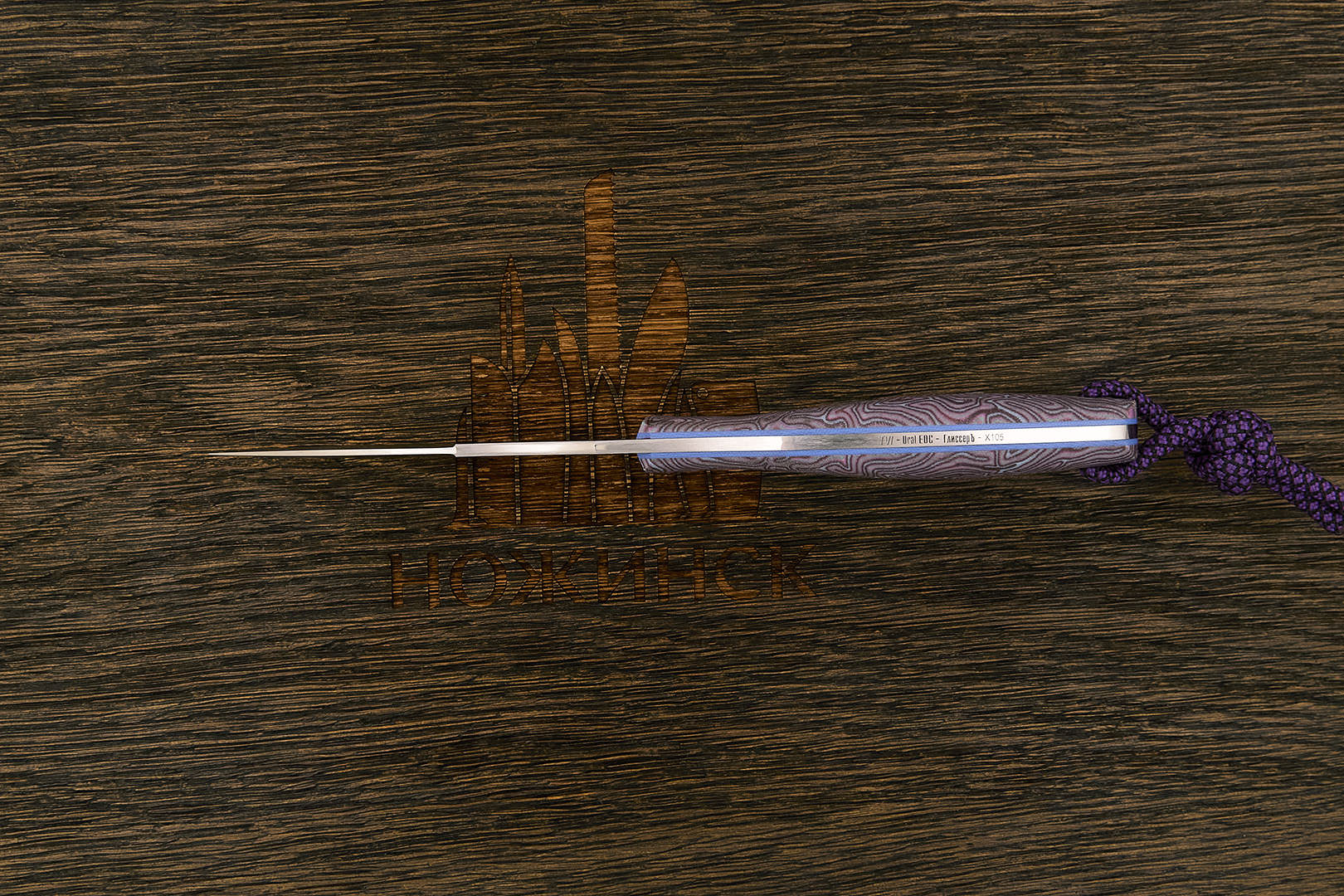 X105CrCoMo18 – коррозионностойкая инструментальная сталь, производится в Германии. Легирована кобальтом, молибденом и ванадием. Оптимальная твердость 58-60 HRC. Легко затачивается и достаточно долго удерживает режущую кромку. Является популярной сталью как для изготовления ножей с фиксированным клинком (в том числе и кухонных), так и складных ножей среднего ценового сегмента.