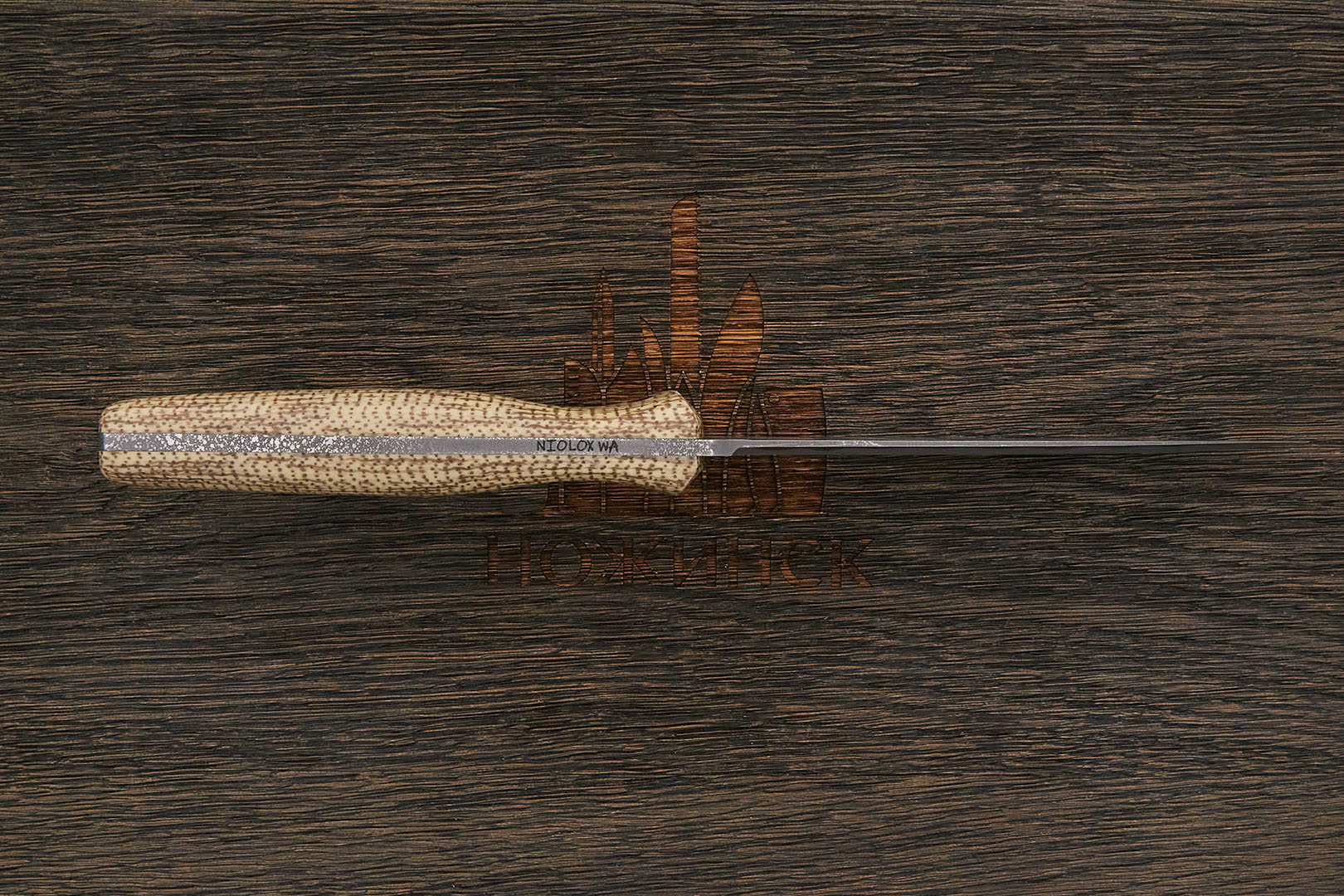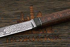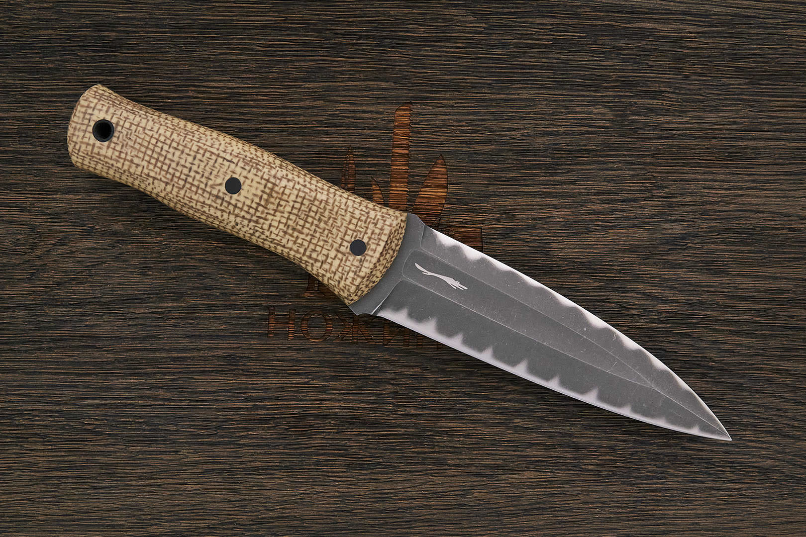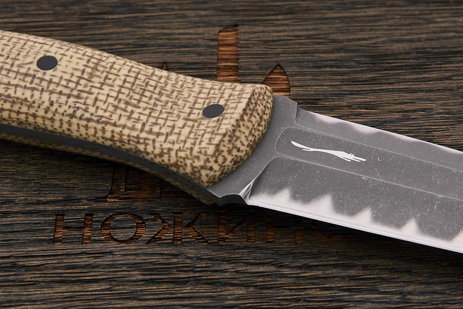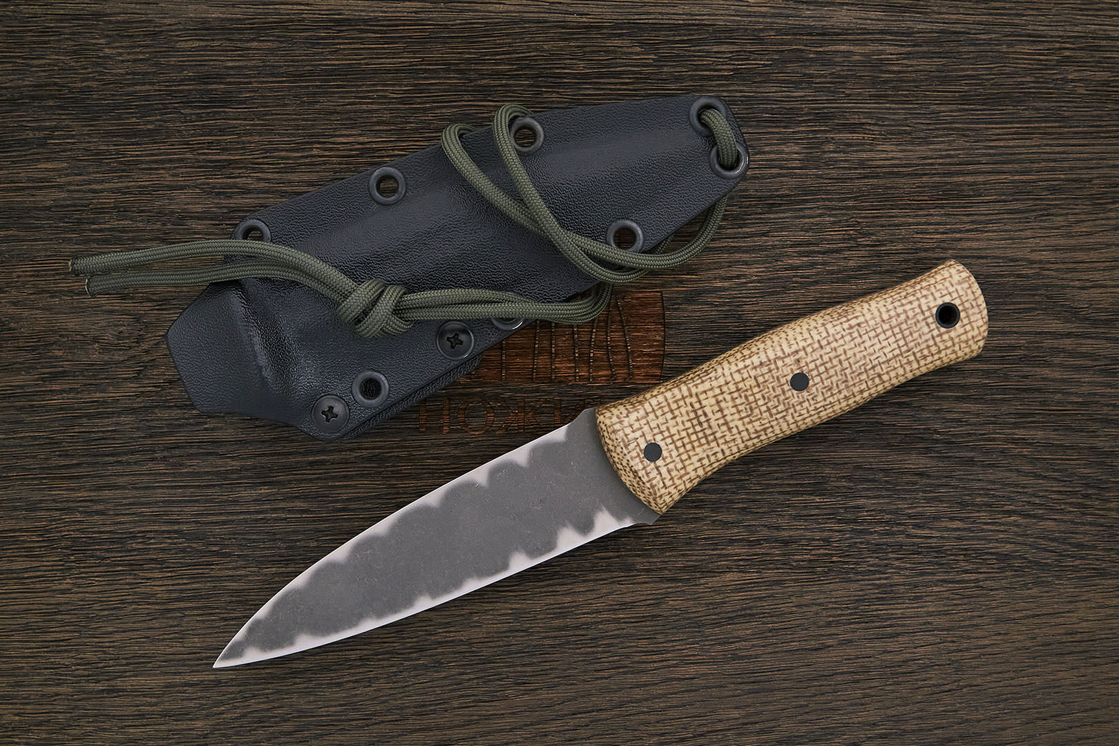Микарта – очень прочный конструкционный материал, представляющий собой слоистый пластик на основе ткани и фенолформальдегидных или эпоксидных смол. Слои ткани пропитываются и склеиваются под высоким давлением и температурой. Благодаря совокупности потребительских свойств micarta (текстолит) прекрасно подходит для изготовления рукоятей ножей. Прочная, не впитывает ни воду, ни запахи, тактильная и высоко декоративная за счет разнообразия текстур и цветов. По теплопроводности микарта близка к натуральному дереву, что позволяет достаточно комфортно использовать ножи на сильном морозе.