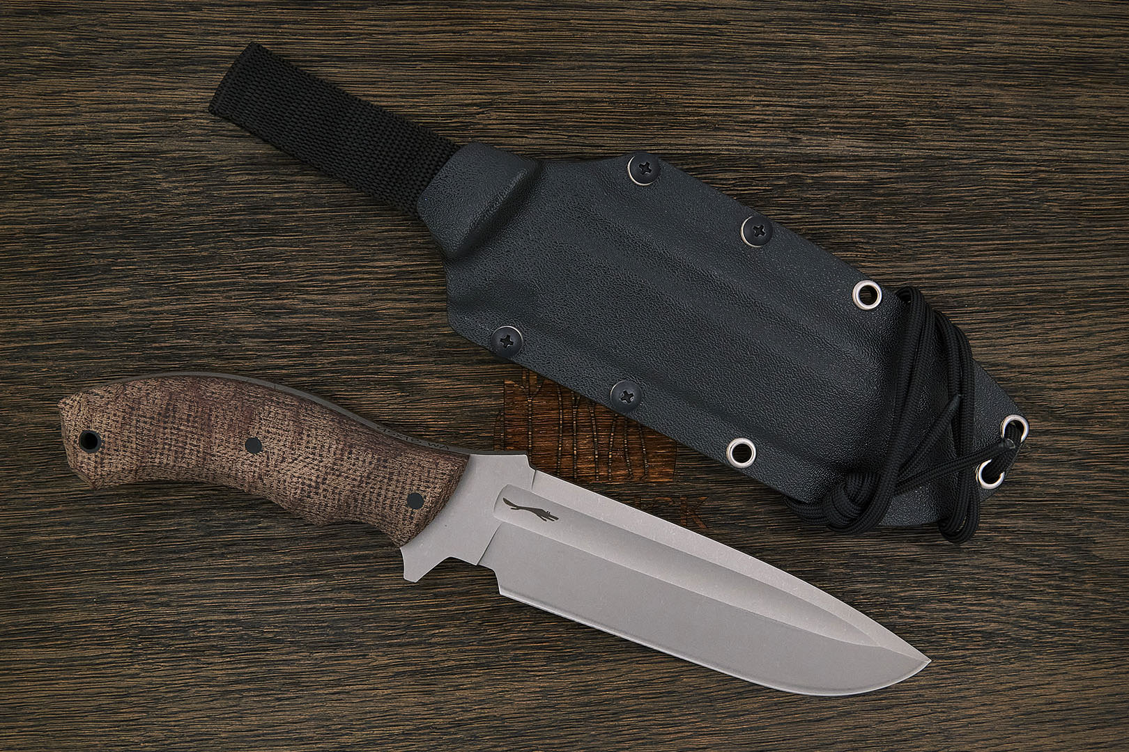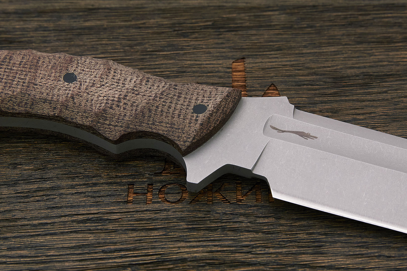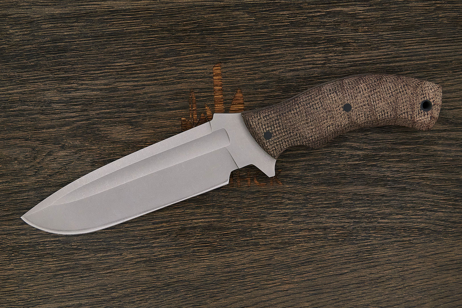 Микарта – очень прочный конструкционный материал, представляющий собой слоистый пластик на основе ткани и фенолформальдегидных или эпоксидных смол. Слои ткани пропитываются и склеиваются под высоким давлением и температурой. Благодаря совокупности потребительских свойств micarta (текстолит) прекрасно подходит для изготовления рукоятей ножей. Прочная, не впитывает ни воду, ни запахи, тактильная и высоко декоративная за счет разнообразия текстур и цветов. По теплопроводности микарта близка к натуральному дереву, что позволяет достаточно комфортно использовать ножи на сильном морозе.