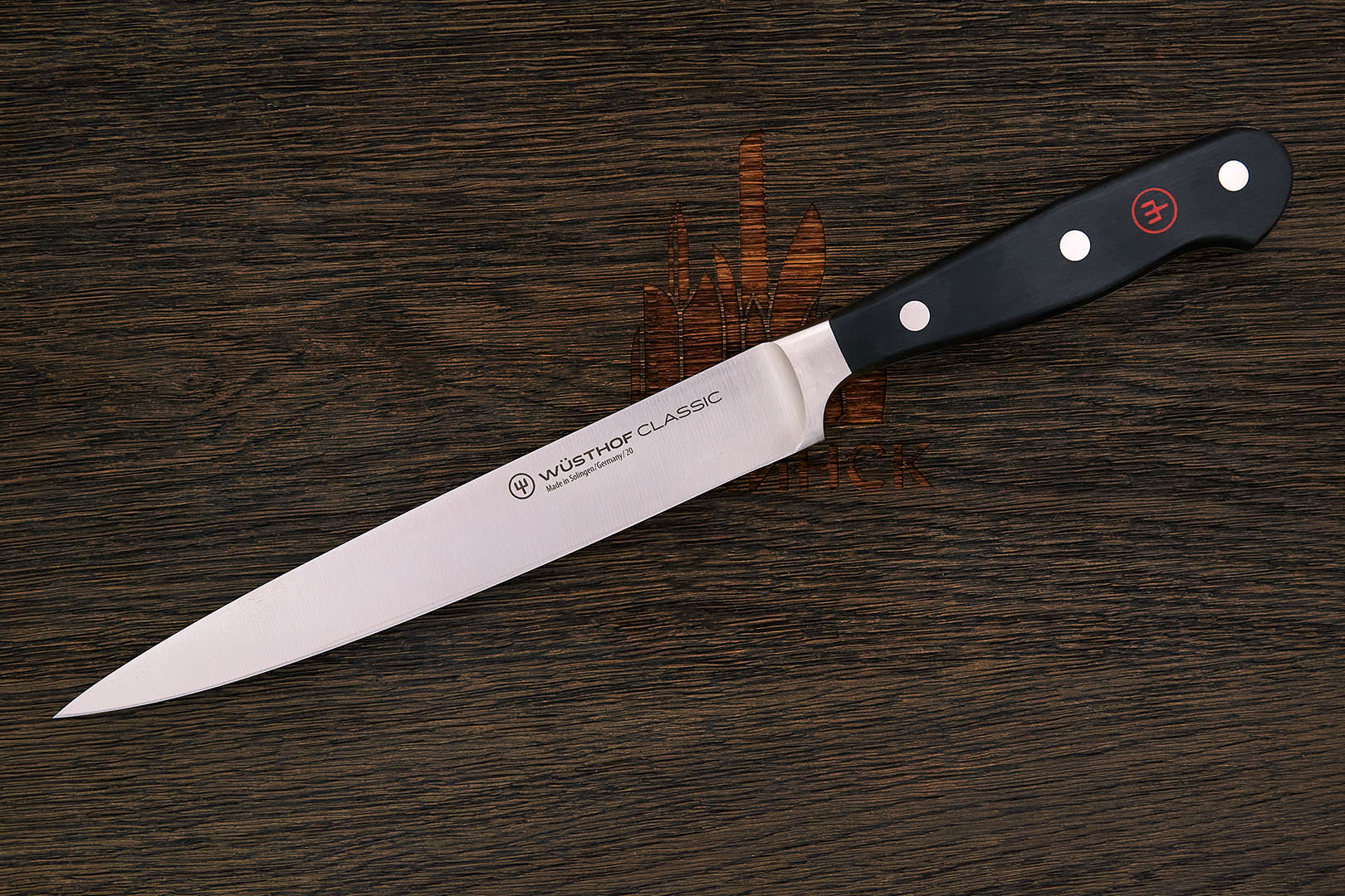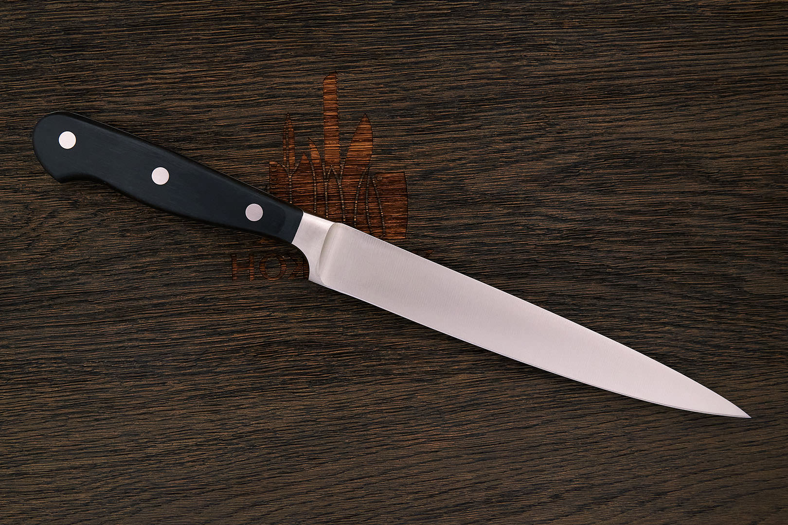 X50CrMoV15 – коррозионностойкая молибден-ванадиевая сталь производства немецкой компании Thyssen-Krupp. Имеет хорошую коррозионную устойчивость, неплохое удержание заточки. Твердость стали в серийных изделиях, как правило, невысокая 54-56 HRC, что позволяет легко править такие ножи металлическим мусатом по европейской кухонной традиции.
