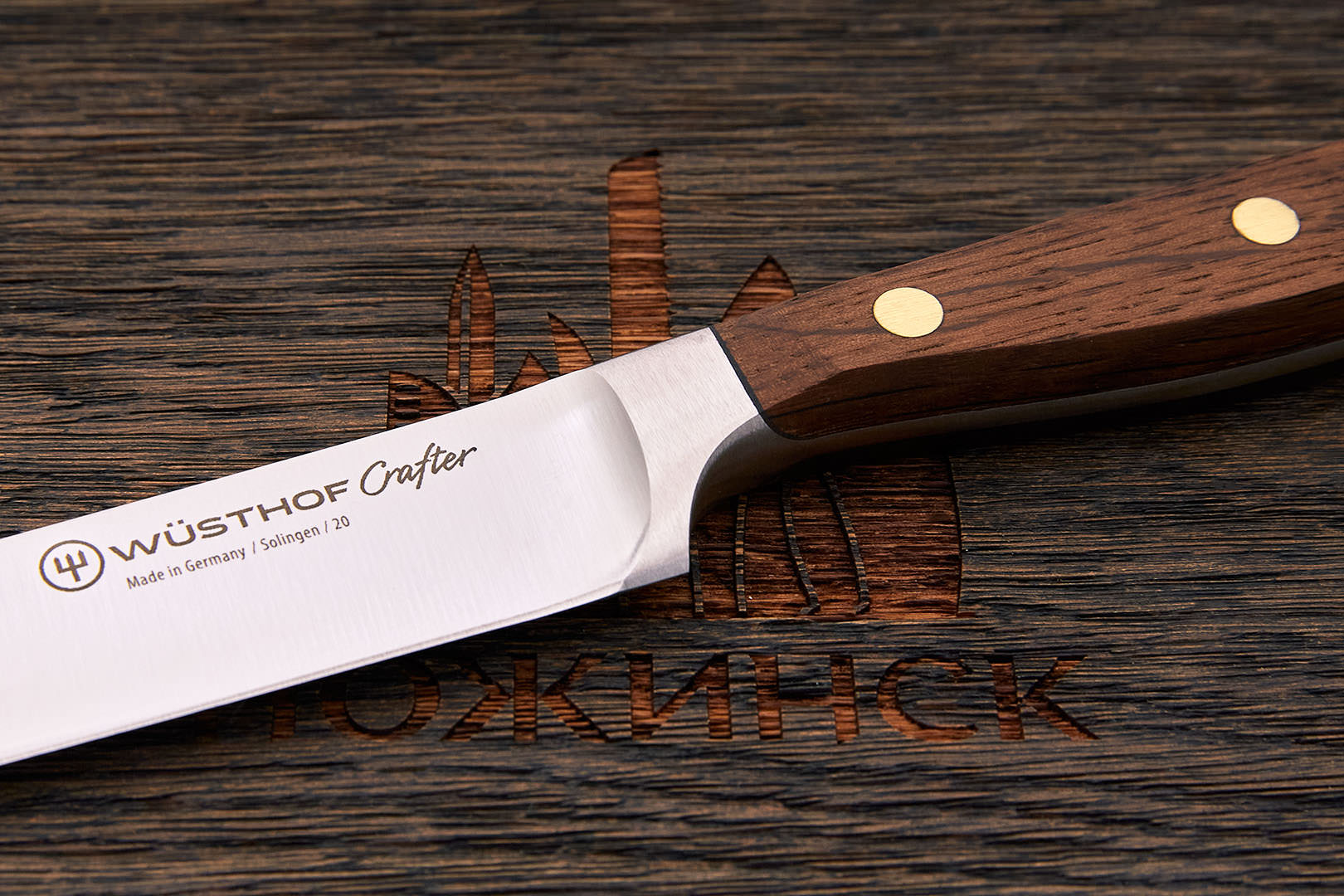 X50CrMoV15 – коррозионностойкая молибден-ванадиевая сталь производства немецкой компании Thyssen-Krupp. Имеет хорошую коррозионную устойчивость, неплохое удержание заточки. Твердость стали в серийных изделиях, как правило, невысокая 54-56 HRC, что позволяет легко править такие ножи металлическим мусатом по европейской кухонной традиции.